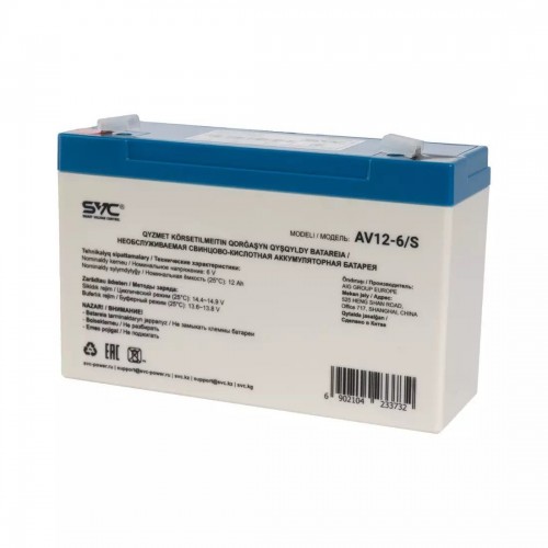 Бренд - SVC. Тип устройства товара - Аккумуляторная батарея. Модель - AV12-6 S. Количество в упаковке - 1. Напряжение питания - 6 В.