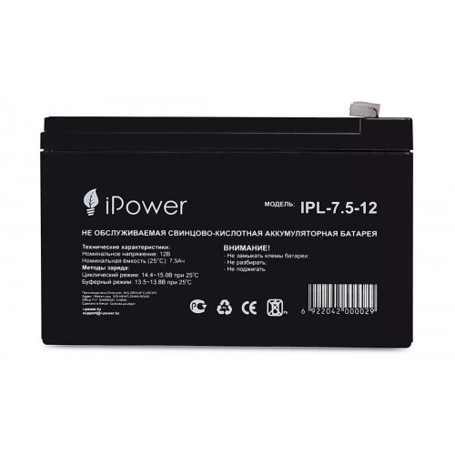 Бренд - iPower. Тип устройства товара - Батарейка. Модель - IPL-7.5-12 L. Количество в упаковке - 1. Напряжение питания - 12B.