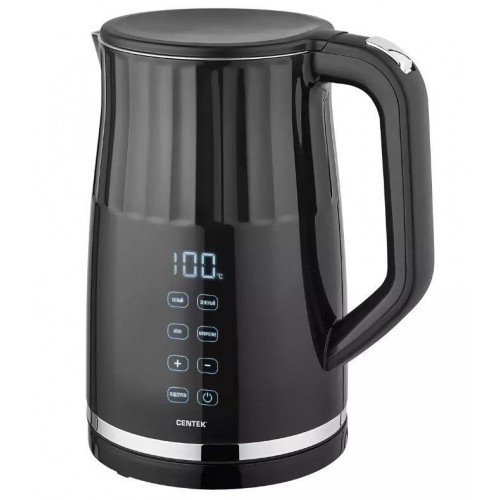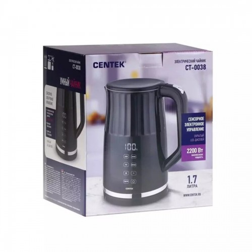 Бренд - Centek. Тип устройства товара - Чайник. Модель - CT-0038. Основной цвет - Чёрный. Дополнительные цвета - Серебристый. Объём (л) - 1,7. Мощность (Вт) - 2200. Материал корпуса - Нержавеющая сталь. Двойные стенки корпуса - есть. Тип нагревательного элемента - Скрытый нагревательный элемент. Фильтр в носике - нет. Установка температуры - есть. Поддержание температуры - есть. Шкала уровня воды - есть. Вращение на подставке - есть. Подсветка - нет. Дополнительно, особенности - Внутренняя LED-подсветка - Нет; Длина кабеля - 75 см; Управление - Сенсорное; Режимы - Поддержание температуры, Установка температуры; Защита от включения без воды; Защита от перегрева; Панель с кнопками управления; Скрытый LED-Дисплей; .