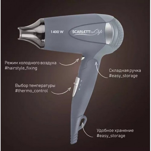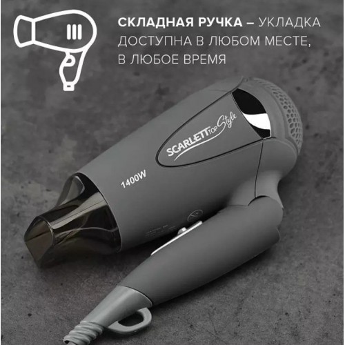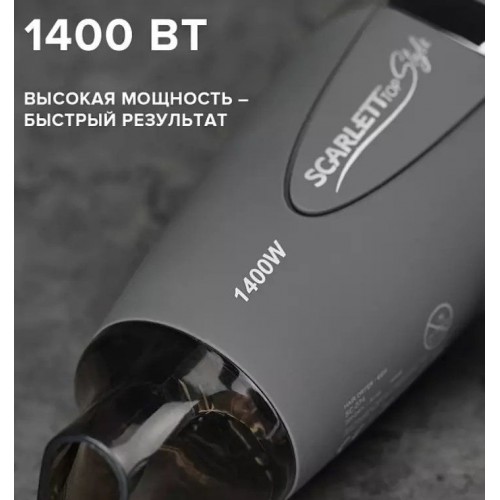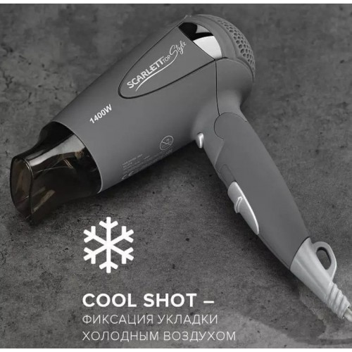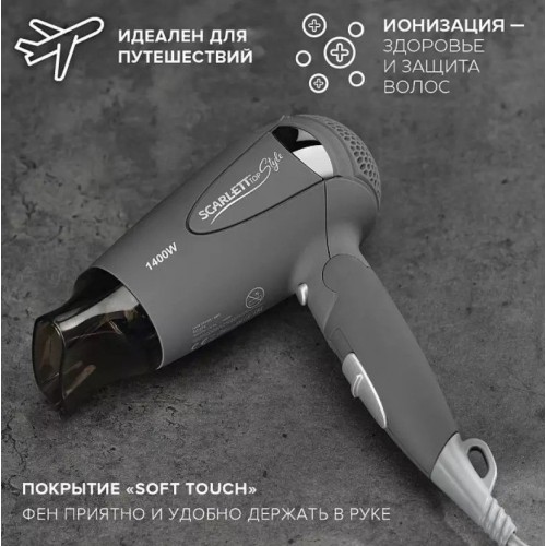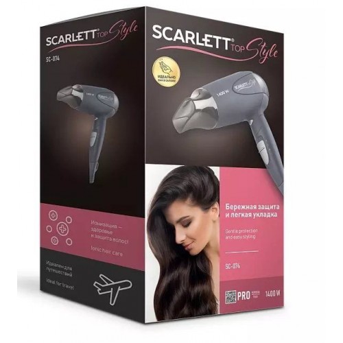 Бренд - Scarlett. Тип устройства товара - Фен. Модель - SC-074. Основной цвет - Серый. Мощность (Вт) - 1400. Количество температурных режимов - 2. Скорости воздушного потока - 2. Подача холодного воздуха - есть. Защита от перегрева - нет. Ионизация - есть. Количество насадок - 1. Комплектация - Насадка - концентратор. Петля для подвешивания - есть. Длина кабеля (м) - есть. Съемный фильтр - нет. Дополнительно, особенности - Защита шнура от перекручивания.