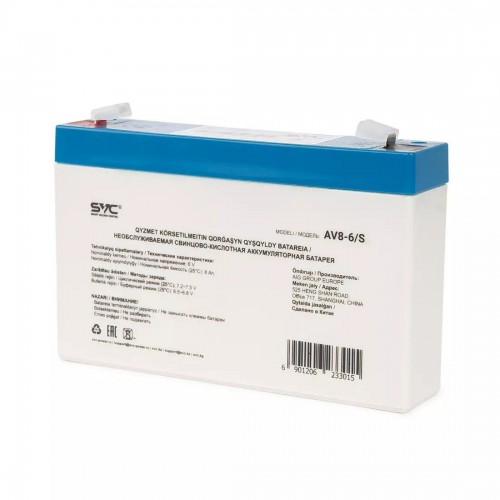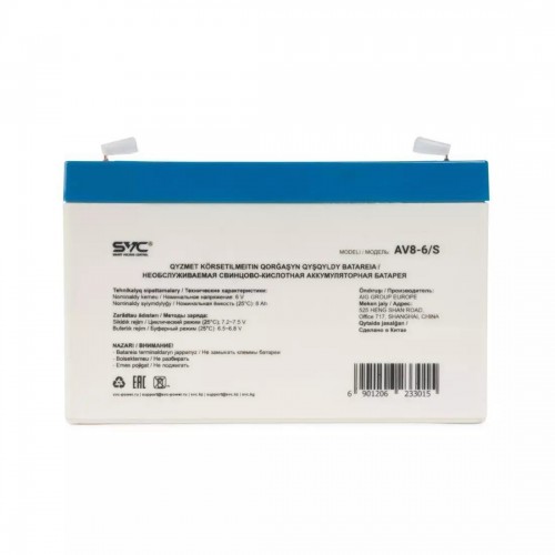 Бренд - SVC. Тип устройства товара - Аккумуляторная батарея. Модель - AV8-6 S. Количество в упаковке - 1. Напряжение питания - 6 В.