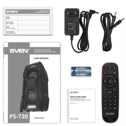 Бренд - Sven. Тип устройства товара - Колонки. Модель - PS-730. Основной цвет - Чёрный. Выходная мощность (Вт) - 100 (2 × 50). Максимальная воспроизводимая частота, Гц - 22000. Беспроводное подключение - есть. Пульт дистанционного управления - Есть. Интерфейсы - AUX","Bluetooth","NFC","USB","MicroSD. Аудио интерфейсы - Два микрофонных входа для караокеt. Беспроводные интерфейсы - BlueTooth","NFC. Питание - литий-ионный aккумулятор: 7.4В, 4400мА*ч (32.56Вт*ч) DC 9 V. Длина (мм) - Китай. Гарантия - 12 месяцев.