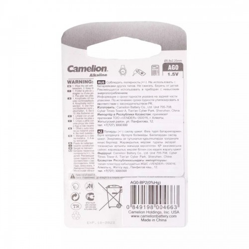 Бренд - CAMELION. Тип устройства товара - Батарейка. Модель - Alkaline AG0-BP2(0%Hg). Напряжение питания - 1164.
