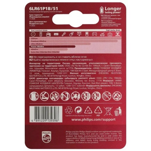 Батарейка Philips 6LR61P1B/51 крона алкалиновая 9V 1 шт. 6LR61/9V-1BL Power (1/12/24/6240). Характеристики товара:
