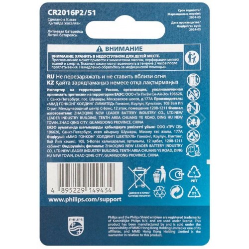 Бренд - Philips. Тип устройства товара - Батарейка. Модель - CR2016P2 51 . Основной цвет - Серебристый. Форм-фактор - CR2016. Количество в упаковке - 2. Вид батарейки - Литиевая. Напряжение питания - 3.