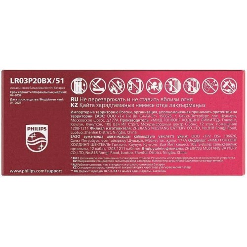 Бренд - Philips. Тип устройства товара - Батарейка. Модель - LR03P20BX 51. Основной цвет - Серебристый. Форм-фактор - AAA . Количество в упаковке - 20. Вид батарейки - Алкалиновая. Напряжение питания - 1.5.