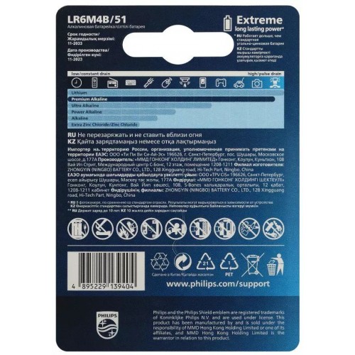 Бренд - Philips. Тип устройства товара - Батарейка. Модель - LR6M4B 51. Основной цвет - Комбинированный. Форм-фактор - AA . Количество в упаковке - 4. Вид батарейки - Алкалиновая. Напряжение питания - 1.5.