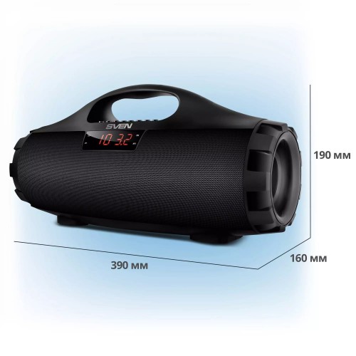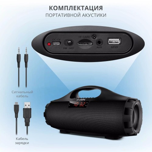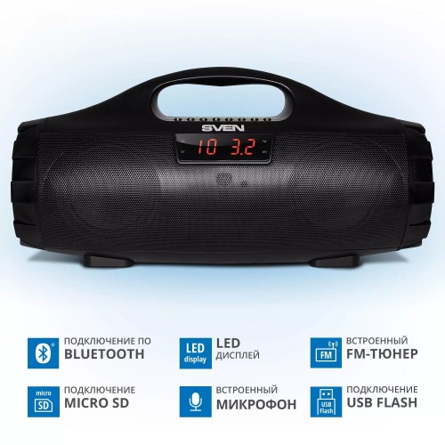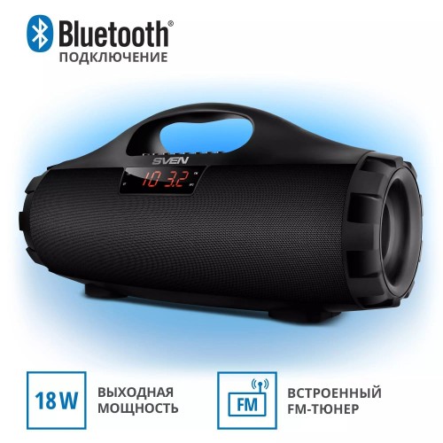 Бренд - Sven. Основной цвет - Чёрный. Выходная мощность (Вт) - 18 (2 × 9). Максимальная воспроизводимая частота, Гц - 20000. Материал корпуса - Пластик. Влагозащищенный корпус - нет. Встроенный микрофон - нет. Беспроводные способы подключения - Bluetooth. Bluetooth - 4.0. Профили Bluetooth - A2DP","AVRCP","HFP","HSP. Воспроизведение с USB накопителей - есть. Линейный AUX вход - есть. Выходы - micro USB. FM радио - есть. Питание - литий-ионный aккумулятор: 7.4В, 1800мА*ч (13.32Вт*ч) USB: DC 5 V. Длина (мм) - Китай. Гарантия - 12 месяцев.