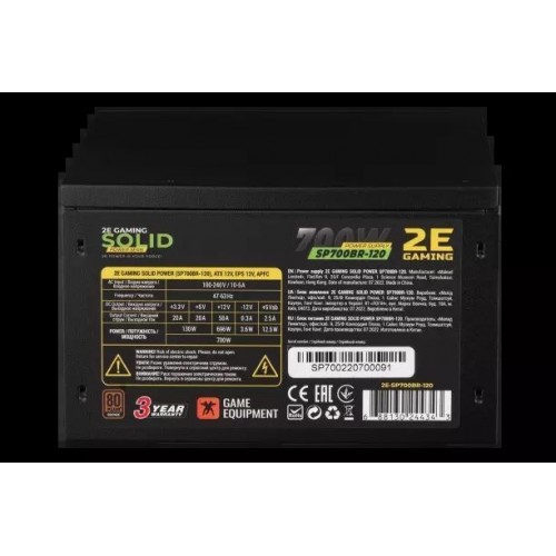 Бренд - 2E. Тип устройства товара - Блок питания. Модель - SOLID . Основной цвет - Чёрный. Форм-фактор корпуса - ATX. Поддержка EPS12V - нет. Корректор коэффициента мощности (PFC) - Активный. Мощность (номинал) - 700 Вт. Ток по линии +5 В - 20A. Ток по линии -12 В - 0.3A. Диапазон входного напряжения сети - 100-240 В. Отстегивающиеся кабели - нет. Основной разъем питания - 20+4 pin. Разъемы для питания процессора (CPU) - 1x 4+4 pin. Разъемы для питания видеокарты (PCI-E) - 4хPCI-E 8 (6+2Piin). Количество разъемов 15-pin SATA - 6. Длина основного кабеля питания - 500 мм. Длина кабеля питания процессора - 650 мм. Размеры вентиляторов (мм) - 120 . Подсветка - нет. Оплетка проводов - нет. Длина (мм) - 12 месяцев.
