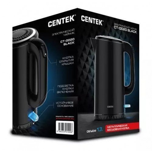 Бренд - Centek. Тип устройства товара - Электрочайник. Модель - CT-0020. Основной цвет - Чёрный. Дополнительные цвета - Серебристый. Объём (л) - 1,7. Мощность (Вт) - 2200. Двойные стенки корпуса - есть. Тип нагревательного элемента - Скрытый нагревательный элемент. Фильтр в носике - есть. Шкала уровня воды - нет. Вращение на подставке - нет. Дополнительно, особенности - Металлическая бесшовная колба.