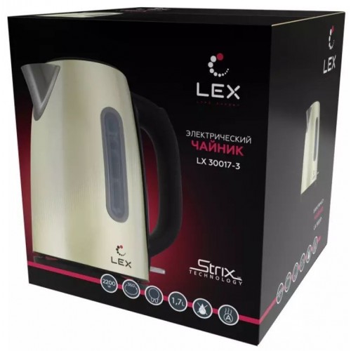 Бренд - Lex. Тип устройства товара - Электрочайник. Модель - LX-30017-3. Основной цвет - Бежевый. Дополнительные цвета - Чёрный. Объём (л) - 1,7. Мощность (Вт) - 2200. Материал корпуса - Нержавеющая сталь. Двойные стенки корпуса - нет. Тип нагревательного элемента - Скрытый нагревательный элемент. Фильтр в носике - нет. Шкала уровня воды - есть. Вращение на подставке - есть. Дополнительно, особенности - защита от включения без воды, защита от перегрева. Длина (мм).