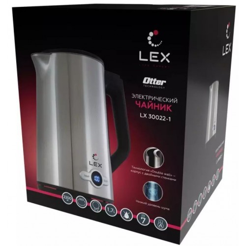 Бренд - Lex. Тип устройства товара - Электрочайник. Модель - LX-30022-1. Основной цвет - Серебристый. Дополнительные цвета - Чёрный. Объём (л) - 1,7. Мощность (Вт) - 2200. Двойные стенки корпуса - нет. Тип нагревательного элемента - Скрытый нагревательный элемент. Фильтр в носике - есть. Шкала уровня воды - нет. Вращение на подставке - есть. Дополнительно, особенности - защита от включения без воды, защита от перегрева. Длина (мм).