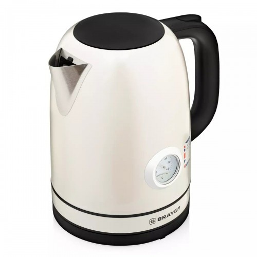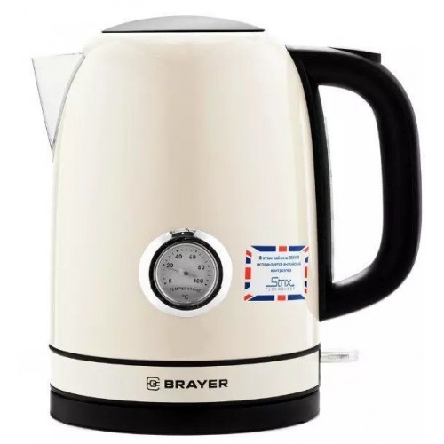 Бренд - BRAYER . Тип устройства товара - Электрочайник. Модель - BR1005YE . Основной цвет - Бежевый. Дополнительные цвета - Чёрный","Белый. Объём (л) - 1,7. Мощность (Вт) - 2200. Материал корпуса - Нержавеющая сталь. Двойные стенки корпуса - нет. Тип нагревательного элемента - Скрытый нагревательный элемент. Фильтр в носике - есть. Установка температуры - нет. Поддержание температуры - нет. Шкала уровня воды - есть. Индикация - Да. Вращение на подставке - есть. Подсветка - нет. Дополнительно, особенности - Английский контроллер VnQ™ by STRIX; Встроенный термометр; Открытие крышки путём нажатия на кнопку; Отключение при отсутствии воды;.