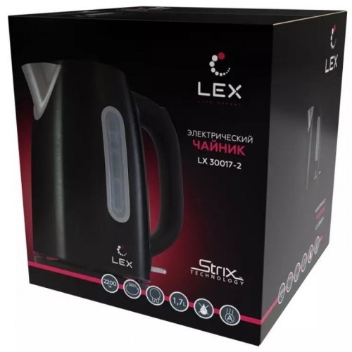 Бренд - Lex. Тип устройства товара - Электрочайник. Модель - LX-30017-2. Основной цвет - Чёрный. Объём (л) - 1,7. Мощность (Вт) - 2200. Материал корпуса - Нержавеющая сталь. Двойные стенки корпуса - нет. Тип нагревательного элемента - Скрытый нагревательный элемент. Фильтр в носике - нет. Шкала уровня воды - есть. Вращение на подставке - есть. Дополнительно, особенности - защита от включения без воды, защита от перегрева. Длина (мм).