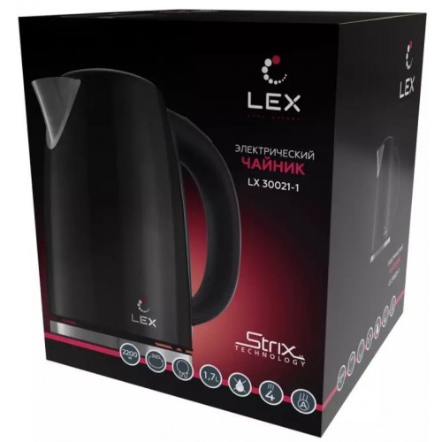 Бренд - Lex. Тип устройства товара - Электрочайник. Модель - LX-30021-1. Основной цвет - Чёрный. Объём (л) - 1,7. Мощность (Вт) - 2200. Материал корпуса - Нержавеющая сталь. Двойные стенки корпуса - нет. Тип нагревательного элемента - Скрытый нагревательный элемент. Фильтр в носике - есть. Установка температуры - есть. Поддержание температуры - нет. Шкала уровня воды - есть. Вращение на подставке - есть. Подсветка - нет. Дополнительно, особенности - защита от включения без воды, защита от перегрева. Длина (мм).