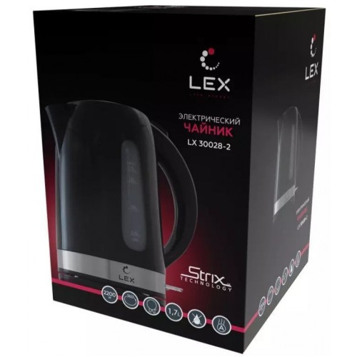Бренд - Lex. Тип устройства товара - Электрочайник. Модель - LX-30028-2. Основной цвет - Чёрный. Объём (л) - 1,7. Мощность (Вт) - 2200. Материал корпуса - Пластик. Двойные стенки корпуса - нет. Тип нагревательного элемента - Скрытый нагревательный элемент. Покрытие нагревательного элемента - Нержавеющая сталь. Фильтр в носике - нет. Шкала уровня воды - есть. Вращение на подставке - есть. Дополнительно, особенности - защита от включения без воды, защита от перегрева. Длина (мм).