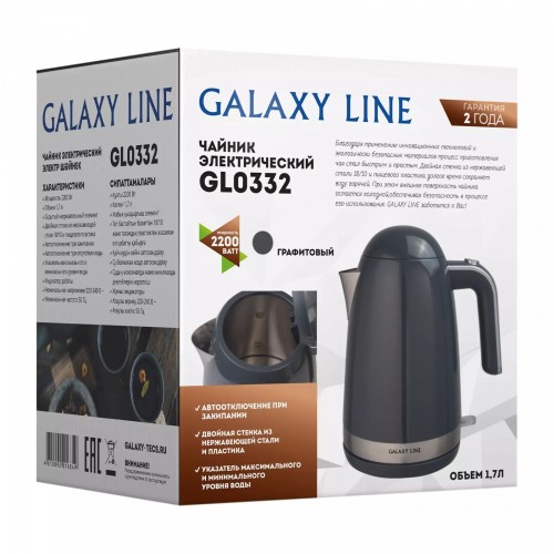 Бренд - Galaxy. Тип устройства товара - Электрочайник. Модель - GL0332. Основной цвет - Графит. Дополнительные цвета - Серебристый. Объём (л) - 1,7. Мощность (Вт) - 2200. Материал корпуса - Нержавеющая сталь, пластик. Двойные стенки корпуса - есть. Тип нагревательного элемента - Скрытый нагревательный элемент. Фильтр в носике - есть. Материал фильтра - Сталь. Шкала уровня воды - есть. Вращение на подставке - есть. Дополнительно, особенности - Автоотключение при закипании; Автоотключение при отсутствии воды:.