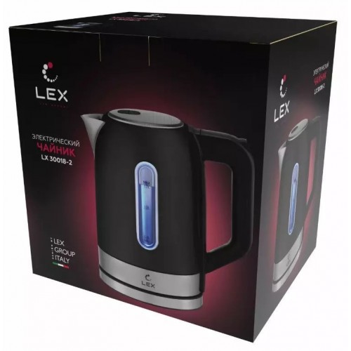 Бренд - Lex. Тип устройства товара - Электрочайник. Модель - LX 30018-2. Основной цвет - Чёрный. Дополнительные цвета - Серебристый. Объём (л) - 1,7. Мощность (Вт) - 2200. Материал корпуса - Нержавеющая сталь. Двойные стенки корпуса - нет. Фильтр в носике - нет. Установка температуры - нет. Поддержание температуры - нет. Шкала уровня воды - есть. Вращение на подставке - есть. Подсветка - есть.