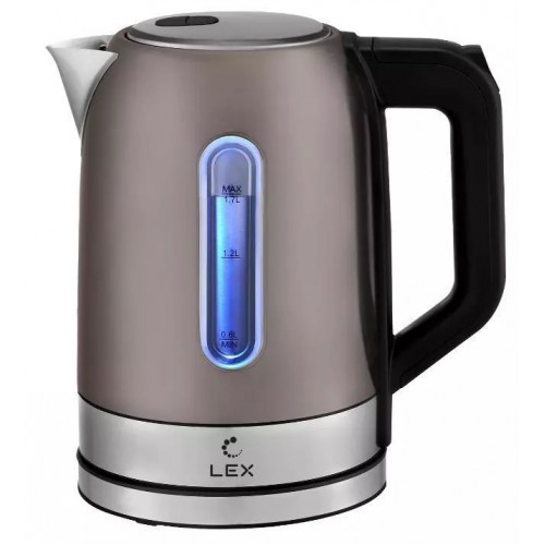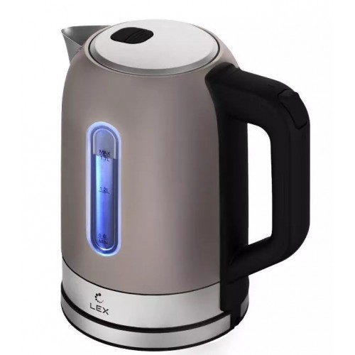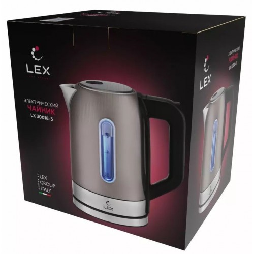 Бренд - Lex. Тип устройства товара - Электрочайник. Модель - LX 30018-3. Основной цвет - Коричневый. Дополнительные цвета - Чёрный","Серебристый. Объём (л) - 1,7. Мощность (Вт) - 2200. Материал корпуса - Нержавеющая сталь. Двойные стенки корпуса - нет. Фильтр в носике - нет. Установка температуры - нет. Поддержание температуры - нет. Шкала уровня воды - есть. Вращение на подставке - есть. Подсветка - есть. Дополнительно, особенности - Блокировка включения без воды.