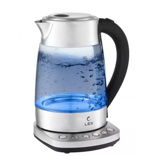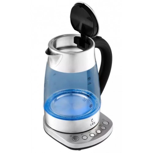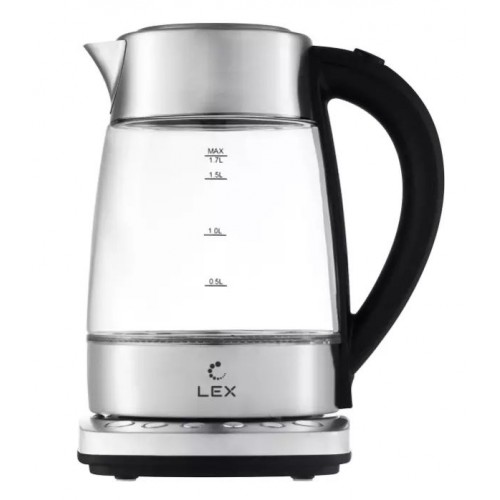 Бренд - Lex. Тип устройства товара - Электрочайник. Модель - LXK 30016-1. Основной цвет - Серебристый. Дополнительные цвета - Чёрный. Объём (л) - 1,7. Мощность (Вт) - 2200. Материал корпуса - Стекло. Двойные стенки корпуса - нет. Фильтр в носике - нет. Установка температуры - нет. Поддержание температуры - есть. Шкала уровня воды - есть. Вращение на подставке - нет. Подсветка - есть.