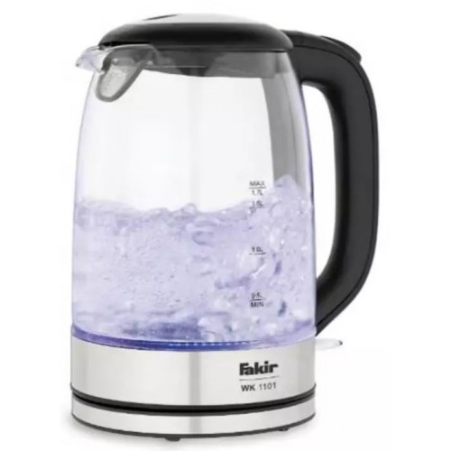 Бренд - Fakir. Тип устройства товара - Электрочайник. Модель - wk1101 . Основной цвет - Серебристый. Дополнительные цвета - Чёрный. Объём (л) - 1,7. Мощность (Вт) - 2200. Материал корпуса - Стекло. Двойные стенки корпуса - нет. Фильтр в носике - нет. Установка температуры - нет. Поддержание температуры - нет. Шкала уровня воды - есть. Вращение на подставке - есть. Подсветка - есть.