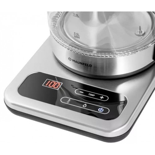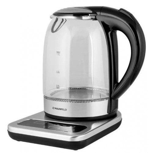Бренд - MAUNFELD. Тип устройства товара - Электрочайник. Модель - MGK-614BK. Основной цвет - Прозрачный. Дополнительные цвета - Чёрный","Серебристый. Объём (л) - 1,7. Мощность (Вт) - 2200. Материал корпуса - Стекло, пластик. Двойные стенки корпуса - нет. Тип нагревательного элемента - Скрытый нагревательный элемент. Фильтр в носике - есть. Установка температуры - есть. Поддержание температуры - есть. Шкала уровня воды - есть. Индикация - Да. Вращение на подставке - есть. Подсветка - есть. Дополнительно, особенности - Защита от перегрева, Функция дехлорирования воды, Дисплей, Индикация включения, Подсветка, Поддержание температуры, Индикация заданной температуры, Отключение при закипании, Индикатор температуры .