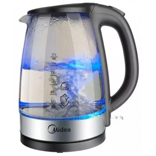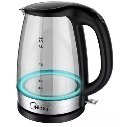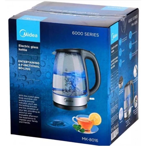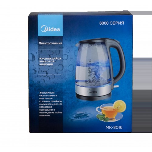 Бренд - Midea. Тип устройства товара - Электрочайник. Модель - MK-8016. Основной цвет - Чёрный. Дополнительные цвета - Серебристый. Объём (л) - 1,7. Материал корпуса - Стекло. Двойные стенки корпуса - нет. Тип нагревательного элемента - Скрытый нагревательный элемент. Фильтр в носике - есть. Материал фильтра - Нейлон. Установка температуры - нет. Поддержание температуры - нет. Шкала уровня воды - есть. Индикация - Да. Вращение на подставке - нет. Подсветка - есть. Дополнительно, особенности - Открытие крышки одним нажатием, Подсветка.