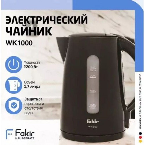 Бренд - Fakir. Тип устройства товара - Электрочайник. Модель - wk1000 . Основной цвет - Чёрный. Объём (л) - 1,7. Мощность (Вт) - 2200. Материал корпуса - Пластик. Двойные стенки корпуса - нет. Тип нагревательного элемента - Скрытый нагревательный элемент. Покрытие нагревательного элемента - Нержавеющая сталь. Фильтр в носике - есть. Установка температуры - нет. Поддержание температуры - нет. Шкала уровня воды - есть. Индикация - Да. Вращение на подставке - есть. Подсветка - нет. Дополнительно, особенности - Защита от перегрева и выкипания.