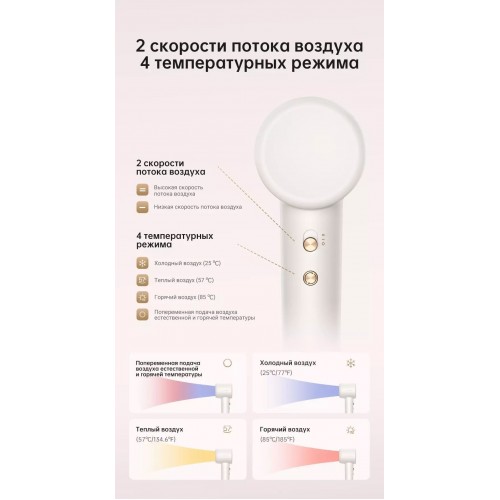 Бренд - Dreame . Тип устройства товара - Фен. Модель - Hair Gleam. Основной цвет - Белый. Материал корпуса - Пластик. Мощность (Вт) - 1600. Количество температурных режимов - 4. Скорости воздуш... →