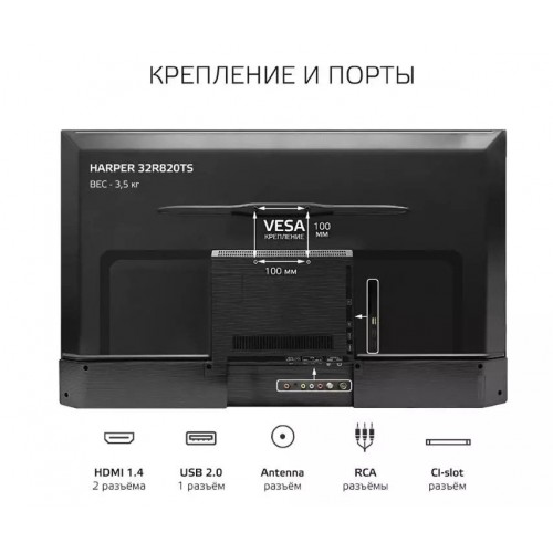 Бренд - HARPER . Модель - 32R820TS . Основной цвет - Чёрный. Голосовое управление - нет. Поддержка HDR - Нет. Функции и особенности - Телетекст. Операционная система - Linux. Автовыключение - нет. Диагональ - 32". Разрешение экрана - 1366x768. Тип HD - FHD. Контрастность (типичная) - 70000:1. Углы обзора по горизонтали вертикали - 178°. Форматное соотношение - 16:9. Частота обновления дисплея - 60 Гц. Наличие Wi-Fi - есть. Ethernet - нет. Miracast - нет. Наличие Smart TV - есть. Количество колонок - 2. Мощность звуковой системы - 12 Вт. Количество HDMI портов - 2. Количество USB 2.0 - 1. Вход для ПК (D-Sub) - нет. Общий интерфейс (CI) - есть. Общий интерфейс Plus (CI+) - нет. Возможность крепления на стену - есть. Стандарт VESA - 100 х 100 мм. Длина (мм) - Китай. Гарантия - 12 месяцев.