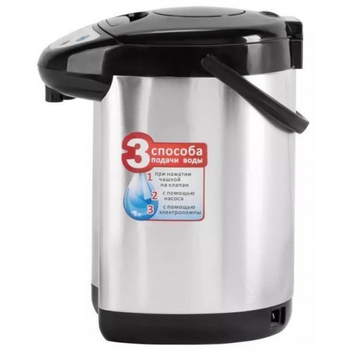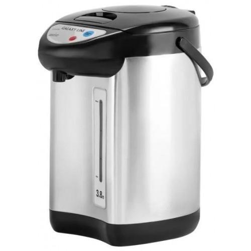 Бренд - Galaxy. Тип устройства товара - Термопот. Модель - GL 0604. Основной цвет - Серебристый. Дополнительные цвета - Чёрный. Объём (л) - 3,8 . Мощность (Вт) - 900. Материал корпуса - Нержавеющая сталь. Подача воды - Ручной насос","При нажатии чашкой на клапан","Электропомпа. Подсветка - нет. Длина кабеля (м) - 12 месяцев.