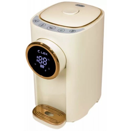 Бренд - Lex. Тип устройства товара - Термопот. Модель - LXTP 3604. Основной цвет - Бежевый. Дополнительные цвета - Золотистый. Объём (л) - 5,0. Мощность (Вт) - 1200. Материал корпуса - Пластик. Выставляемые температуры - 85°С","95°С","45°С","55°С","65°С. Защита - От перегрева. Подсветка - нет. Длина кабеля (м) - 36 месяцев.