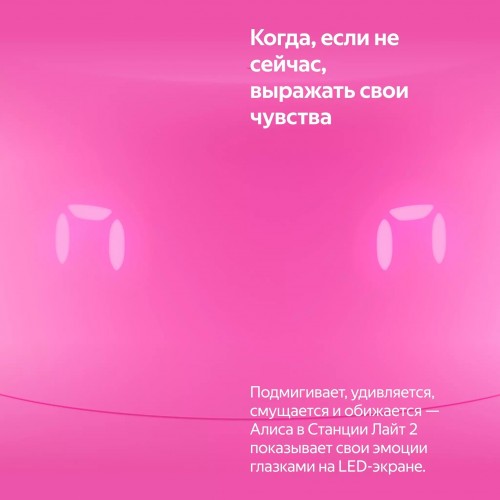 Бренд - Яндекс. Модель - Новая Лайт 2. Основной цвет - Розовый. Выходная мощность (Вт) - 6. Максимальная воспроизводимая частота, Гц - 20000 Гц. Влагозащищенный корпус - нет. Встроенный микрофон - есть. Количество динамиков - 1. Количество микрофонов - 2. Беспроводные способы подключения - Bluetooth","Wi-Fi. Воспроизведение с USB накопителей - нет. Линейный AUX вход - нет. Экосистема - Яндекс. FM радио - нет. Страна производитель - Китай. Гарантия - 12 месяцев.