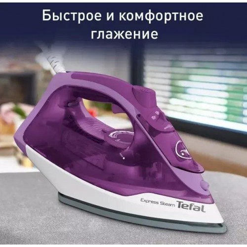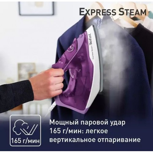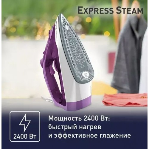Бренд - Tefal. Тип устройства товара - Утюг. Модель - Express Steam FV2836E0. Основной цвет - Фиолетовый. Мощность (Вт) - 2400 . Материал подошвы - Xpress Glide. Паровой удар - есть. Функция разбрызгивания - нет. Вертикальное отпаривание - есть. Автоматическое отключение - нет. Система защиты от накипи - нет. Система самоочистки - есть. Желобок для пуговиц - нет. Шаровое крепление шнура - нет. Насадка для деликатных тканей - нет. Наличие мерного стакана - нет. Емкость для резервуара - 250-300 мл. Гарантия - 12 месяцев.