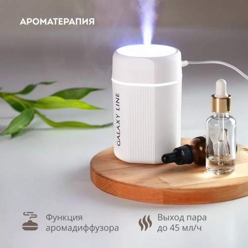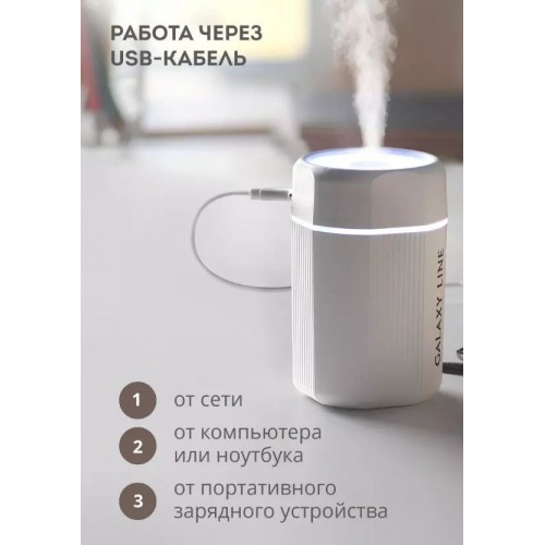 Бренд - Galaxy. Тип устройства товара - Увлажнитель воздуха. Модель - GL8013. Основной цвет - Белый. тип увлажнителя - Ультразвуковой. Установка - Напольная настольная. Потребляемая мощность (Вт) - 2. Время автономной работы, ч - до 8 . Управление - Механическое. Ультразвуковое увлажнение - есть. Емкость (л) - нет. Дисплей - нет. Индикатор низкого уровня воды - нет. Индикатор загрязнения фильтра - нет. Таймер включения выключения - нет. Подсветка - есть. Ширина (мм).