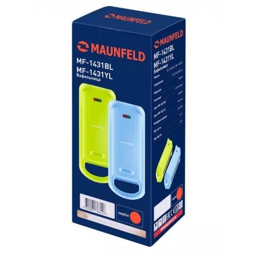 Тип устройства товара - Вафельница. Бренд - MAUNFELD. Модель - MF-1431BL. Основной цвет - Голубой. Дополнительные цвета - Чёрный. Мощность (Вт) - 700. Количество отделений - 2. Сменные панели - Съемные панели. Материал корпуса - Пластик. Антипригарное покрытие - есть. Термоизолированный корпус - нет. Функция подогрева - нет. Одностороннее обжаривание - нет. Защита от перегрева - нет. Индикация включения - есть. Поддержание температуры - нет. Ручка с защитой от нагревания - нет. Ручной выбор времени приготовления - нет. Дисплей - нет. Длина кабеля (м) - Китай. Гарантия - 12 месяцев.