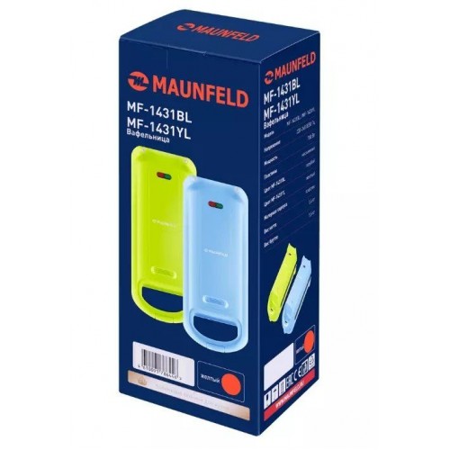 Тип устройства товара - Вафельница. Бренд - MAUNFELD. Модель - MF-1431YL. Основной цвет - Жёлтый. Дополнительные цвета - Чёрный. Мощность (Вт) - 700. Количество отделений - 2. Сменные панели - Съемные панели. Материал корпуса - Пластик. Антипригарное покрытие - есть. Термоизолированный корпус - нет. Функция подогрева - нет. Одностороннее обжаривание - нет. Защита от перегрева - нет. Индикация включения - есть. Поддержание температуры - нет. Ручка с защитой от нагревания - нет. Ручной выбор времени приготовления - нет. Дисплей - нет. Длина кабеля (м) - Китай. Гарантия - 12 месяцев.